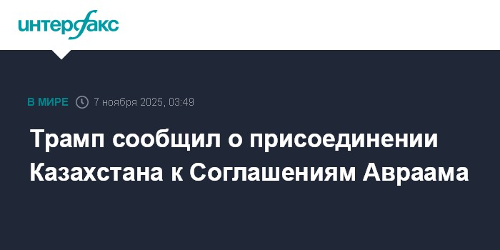 Москва. 7 ноября. INTERFAX.RU - Президент США Дональд Трамп подтвердил, что Казахстан присоединяется к Соглашениям Авраама о нормализации отношений с Израилем.