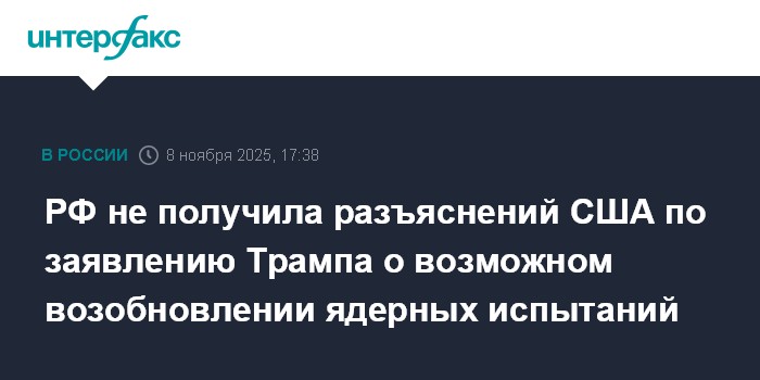 "Нет, пока каких-либо объяснений, что имел в виду президент Трамп, когда заявлял о возобновлении ядерных испытаний, мы по дипломатической линии не получили", - сообщил он в субботу журналистам, отвечая на соответствующий вопрос.