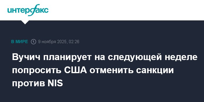 Москва. 9 ноября. INTERFAX.RU - Президент Сербии Александр Вучич намерен в начале следующей недели попросить США отменить решение о санкциях в отношении сербской компании NIS, сообщает телеканал РТС.