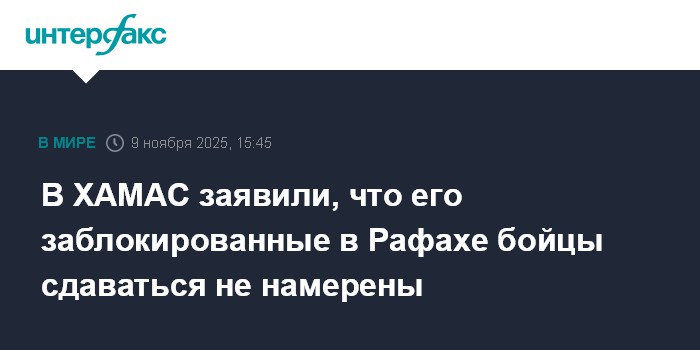 Москва. 9 ноября. INTERFAX.RU - В движении ХАМАС в воскресенье заявили, что его бойцы, которые оказались блокированы в секторе Газа в Рафахе на удерживаемой Израилем территории, не намерены складывать оружие.