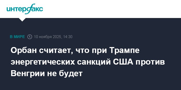 Москва. 10 ноября. INTERFAX.RU - Премьер Венгрии Виктор Орбан в понедельник выразил уверенность, что до тех пор, пока президентом США остается Дональд Трамп, Будапешту не будут грозить американские санкции в сфере энергетики.