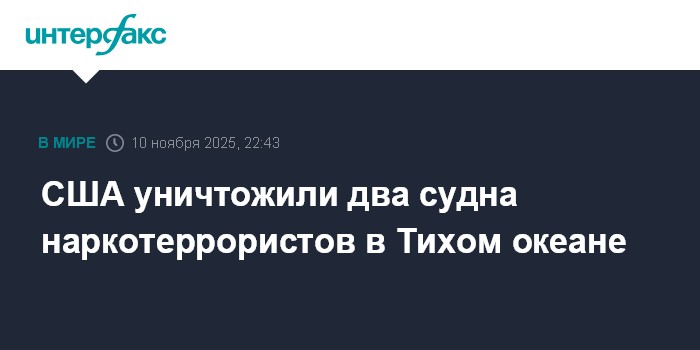 Москва. 10 ноября. INTERFAX.RU - Соединенные Штаты нанесли удары по двум катерам наркотеррористов в восточной части Тихого океана, сообщил в понедельник глава Пентагона Пит Хегсет.