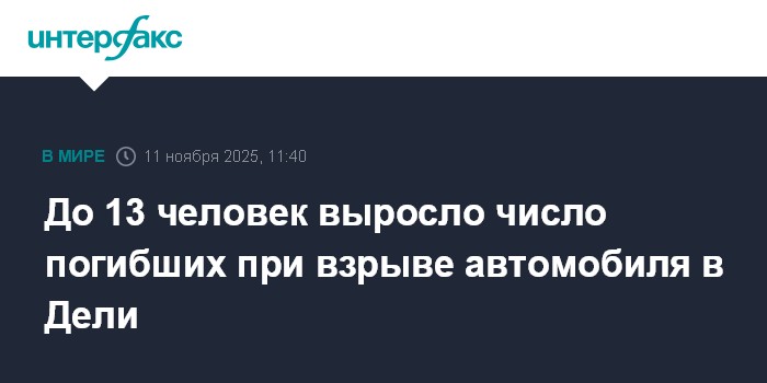 Москва. 11 ноября. INTERFAX.RU - Число погибших при взрыве автомобиля накануне в Дели выросло до 13 человек, сообщает во вторник газета The Hindustan Times.