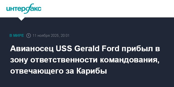 Москва. 11 ноября. INTERFAX.RU - Авианосная ударная группа ВМС США во главе с авианосцем USS Gerald R. Ford вошла в зону ответственности Южного командования ВС США, к которой относятся Карибское море, Центральная и Южная Америка, заявил Четвертый флот ВМС США.