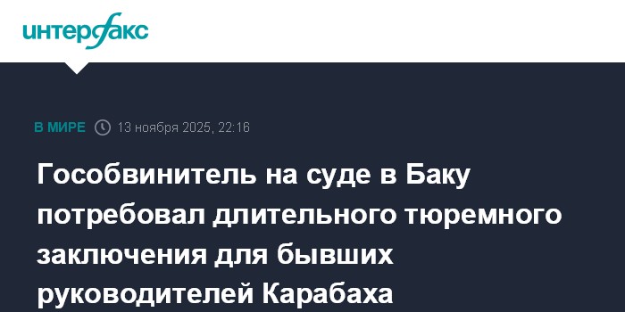 Москва. 13 ноября. INTERFAX.RU - Гособвинитель на суде в Баку запросил приговорить к длительным тюремным заключениям бывших руководителей Нагорного Карабаха, обвиняемых в военных преступлениях против Азербайджана и азербайджанского народа.