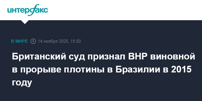 Москва. 14 ноября. INTERFAX.RU - Высокий суд Англии признал австралийскую BHP виновной по законодательству Бразилии в прорыве плотины на хвостохранилище шахты Fundao в бразильском штате Минас-Жерайс в ноябре 2015 года, сообщила BHP.