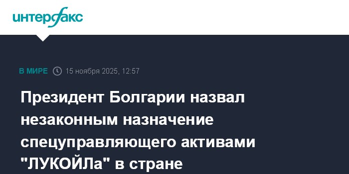 Москва. 15 ноября. INTERFAX.RU - Президент Болгарии Румен Радев назвал незаконным назначение исполнительного директора Национального агентства по доходам Румена Спецова на должность специального коммерческого управляющего активами "ЛУКОЙЛа" на территории страны, сообщает в субботу Болгарское национальное радио.