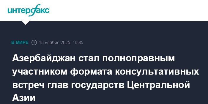 Москва. 16 ноября. INTERFAX.RU - Президент Узбекистана Шавкат Мирзиёев объявил о присоединении Азербайджана к формату консультативных встреч глав государств Центральной Азии в качестве полноправного участника.