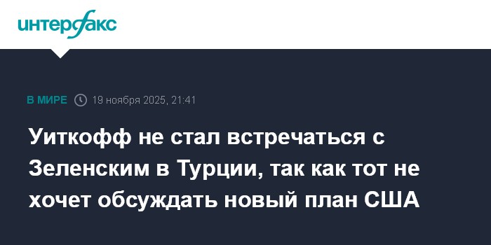 Москва. 19 ноября. INTERFAX.RU - Спецпосланник президента США Стив Уиткофф в среду не стал проводить встречу с президентом Украины Владимиром Зеленским, когда выяснилось, что тот не намерен обсуждать новый американский план по украинскому урегулированию, сообщает портал Axios со ссылкой на источник.