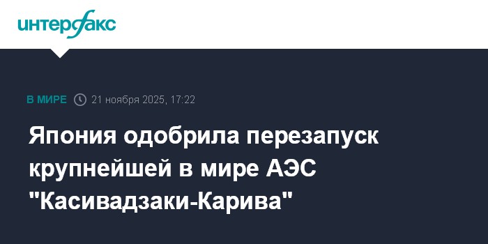 Москва. 21 ноября. INTERFAX.RU - Глава японской префектуры Ниигата Хидэё Ханадзуми одобрил перезапуск двух реакторов крупнейшей в мире АЭС "Касивадзаки-Карива" компании Tokyo Electric Power, пишет Bloomberg.