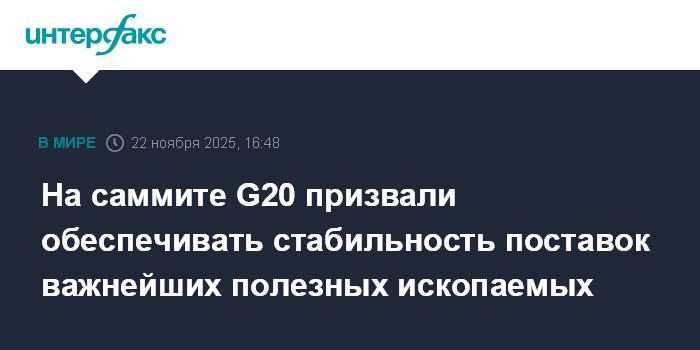 Москва. 22 ноября. INTERFAX.RU - Участники проходящего в ЮАР саммита G20 заявили о необходимости гарантировать устойчивость каналов снабжения ключевыми минеральными ресурсами, говорится в итоговой декларации.