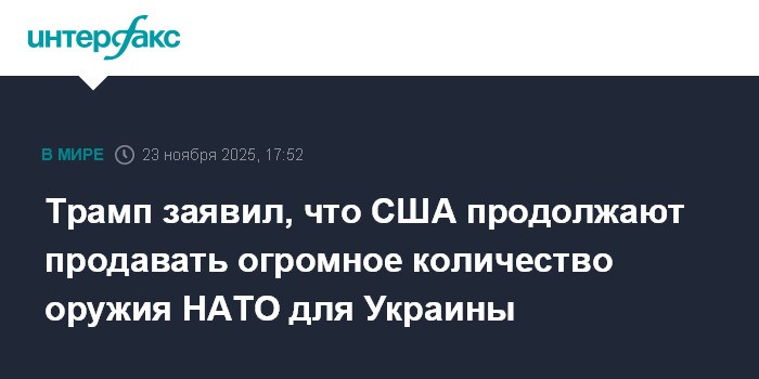 Москва. 23 ноября. INTERFAX.RU - Президент США Дональд Трамп заявил, что Соединенные Штаты продолжают продавать большое количество вооружений странам НАТО для поставок на Украину.