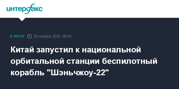 Москва. 25 ноября. INTERFAX.RU - Китайская ракета-носитель "Великий поход-2Ф" (Long March-2F) вывела на орбиту космический корабль "Шэньчжоу-22", который должен будет пристыковаться к национальной орбитальной станции "Тяньгун", сообщило Управление программы пилотируемых космических полетов КНР (CMSA).