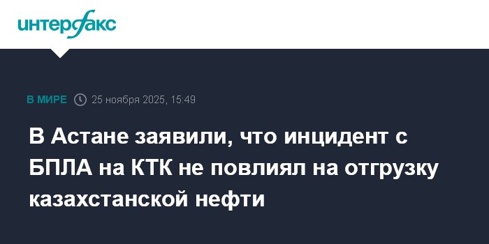 Москва. 25 ноября. INTERFAX.RU - Казахстан отгружает нефть на КТК в штатном режиме, ночной инцидент с БПЛА не повлиял на процесс отгрузки и транспортировки, сообщила "Интерфаксу" официальный представитель министерства энергетики Асель Серикпаева.