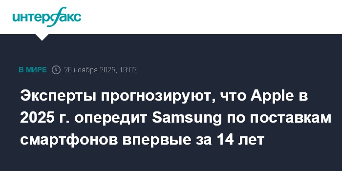 Москва. 26 ноября. INTERFAX.RU - Apple Inc. в 2025 году опередит южнокорейскую Samsung Electronics по глобальным поставкам смартфонов впервые за 14 лет, прогнозируют эксперты Counterpoint Research.