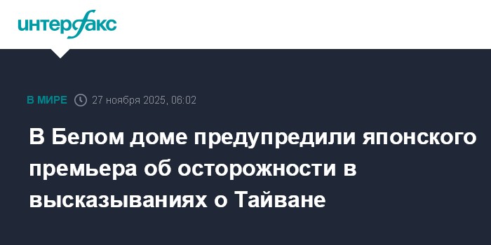 Москва. 27 ноября. INTERFAX.RU - Президент США Дональд Трамп в состоявшемся на этой неделе телефонном разговоре с премьер-министром Японии Санаэ Такаити посоветовал проявлять сдержанность в вопросах, связанных с Тайванем, сообщила The Wall Street Journal.