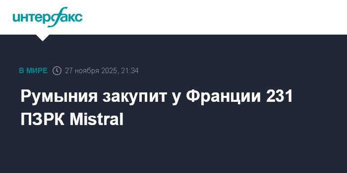 Москва. 27 ноября. INTERFAX.RU - Министерство обороны Румынии объявило, что приобретет французские зенитно-ракетные комплексы Mistral на сумму около 626 млн евро по соглашению о совместных закупках с рядом других стран Евросоюза, сообщил румынский портал Reporteri.