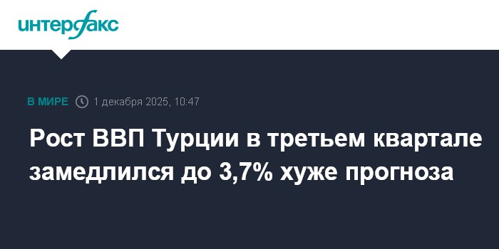 Москва. 1 декабря. INTERFAX.RU - Экономика Турции в третьем квартале 2025 года выросла на 3,7% в годовом выражении, говорится в отчете статистического института страны (TurkStat).