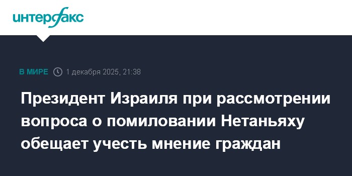 Москва. 1 декабря. INTERFAX.RU - Президент Израиля Ицхак Герцог в понедельник заявил, что при принятии решения о возможности помилования премьера страны Биньямина Нетаньяху, проходящего по ряду судебных разбирательств, будет руководствоваться интересами страны и граждан.