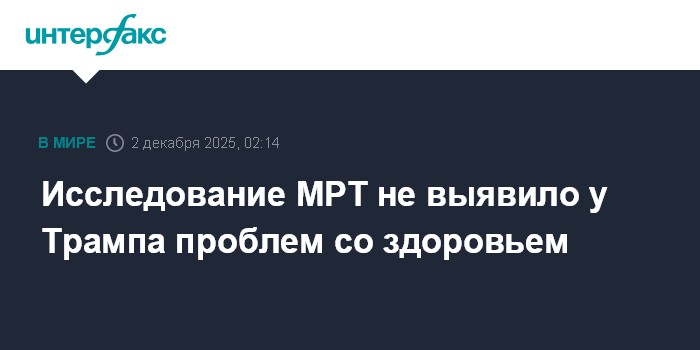 Москва. 2 декабря. INTERFAX.RU - Президент США Дональд Трамп в октябре прошел МРТ исследование сердца и брюшной полости, согласно его результатам, состояние здоровья американского лидера в норме, сообщил врач Белого дома Шон Барбарелла.
