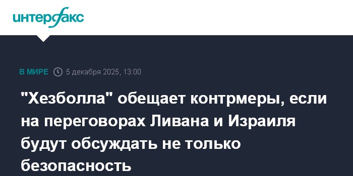 Москва. 5 декабря. INTERFAX.RU - Движение "Хезболла" настаивает на том, чтобы ливано-израильские переговоры фокусировались лишь на вопросах безопасности, в противном случае в движении обещают предпринять ответные действия, сообщает в пятницу The National со ссылкой на источник.