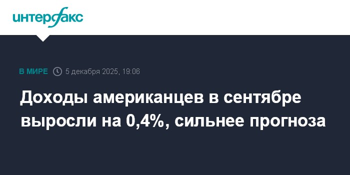 Москва. 5 декабря. INTERFAX.RU - Доходы населения США в сентябре выросли на 0,4% по сравнению с предыдущим месяцем, расходы - на 0,3%, сообщается в отчете министерства торговли страны.