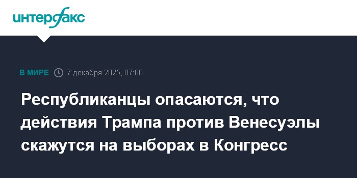Москва. 7 декабря. INTERFAX.RU - Республиканцы обеспокоены тем, что американские удары по судам, якобы перевозящим наркотики, и угрозы президента США Дональда Трампа начать наземную операцию против Венесуэлы могут отрицательно сказаться на итогах выборов в Конгресс, сообщает The Washington Post.