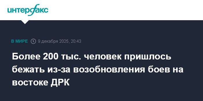 Москва. 9 декабря. INTERFAX.RU - Свыше 200 тыс. человек были вынуждены покинуть свои дома после того, как на прошлой неделе на востоке Демократической Республики Конго (ДРК) вновь активизировались бои между конголезскими военными и группировкой "Движение 23 марта" (М23), сообщает во вторник Bloomberg со ссылкой на заявление ООН.