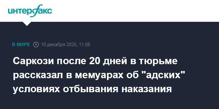 Москва. 10 декабря. INTERFAX.RU - Бывший президент Франции Николя Саркози, который ранее провел почти три недели в тюрьме, в мемуарах рассказывает о суровых, по его мнению, условиях и проблемах, с которыми он столкнулся, отбывая наказание.