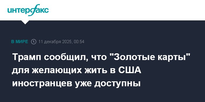 Москва. 11 декабря. INTERFAX.RU - США запустили проект по выдаче "золотых карт" для состоятельных иностранцев, которые хотят жить в стране и в дальнейшем получить ее гражданство, заявил президент США Дональд Трамп.