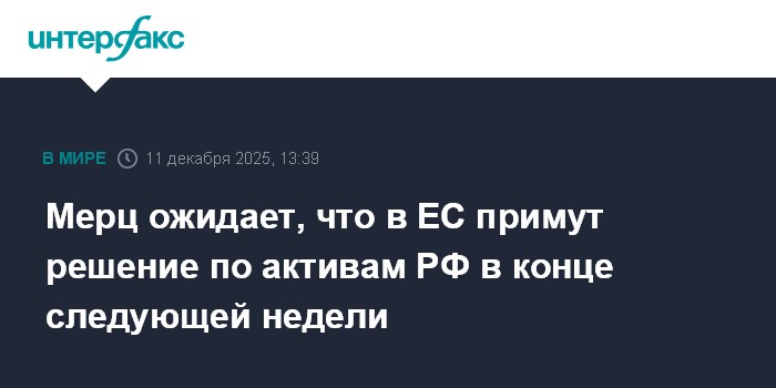 Москва. 11 декабря. INTERFAX.RU - Канцлер ФРГ Фридрих Мерц в четверг заявил, что лидеры ЕС в конце следующей недели могут достичь соглашения об использовании замороженных российских активов.