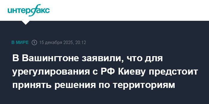 Москва. 15 декабря. INTERFAX.RU - В Вашингтоне ожидают, что Киеву предстоит принять решение по территориальным вопросам для урегулирования украинского конфликта, сообщает в понедельник телеканал Sky News со ссылкой на американские официальные лица.
