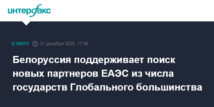 Москва. 21 декабря. INTERFAX.RU - Белоруссия поддерживает поиск новых партнеров ЕАЭС из числа стран Глобального большинства, заявил президент республики Александр Лукашенко на заседании Высшего Евразийского экономического совета в узком составе в Петербурге.