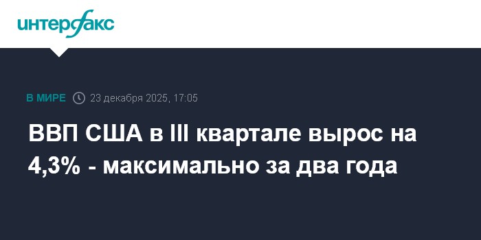 Москва. 23 декабря. INTERFAX.RU - Экономика США в третьем квартале 2025 года увеличилась на 4,3% в пересчете на годовые темпы, сообщило Минторговли страны.