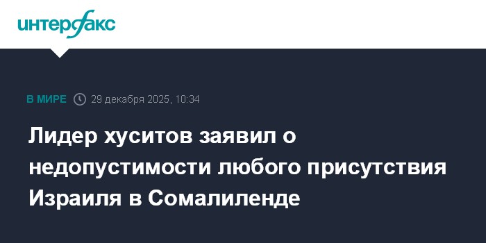 Москва. 29 декабря. INTERFAX.RU - Лидер хуситов Абдул-Малик аль-Хуси заявил, что движение будет рассматривать любое израильское присутствие в Сомалиленде, о признании независимости которого Израиль объявил на прошлой неделе, как цель для возможных ударов, сообщает в понедельник телеканал "Аль-Арабийя".
