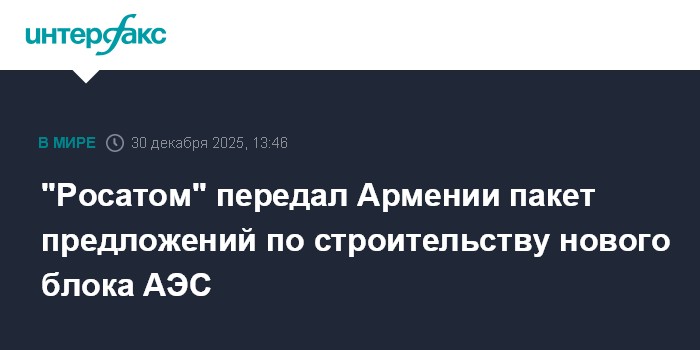 Москва. 30 декабря. INTERFAX.RU - Госкорпорация "Росатом" передала Армении пакет детально проработанных предложений по строительству в республике нового энергоблока АЭС, заявил посол России в Армении Сергей Копыркин.