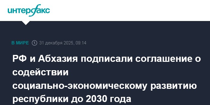 Москва. 31 декабря. INTERFAX.RU - Абхазский министр экономики Теймураз Миквабия и замминистра экономического развития РФ Сергей Назаров подписали "Соглашение о содействии реализации Государственной программы социально-экономического развития Абхазии на 2026-2030 годы", сообщает пресс-служба Минэкономики республики.