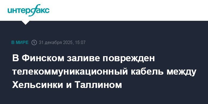 Москва. 31 декабря. INTERFAX.RU - В Финском заливе поврежден телекоммуникационный кабель Elisa между Хельсинки и Таллином, сообщила в среду пресс-служба полиции Финляндии.
