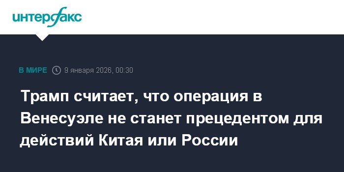 Москва. 9 января. INTERFAX.RU - Операция США в Венесуэле не станет прецедентом, который Китай или Россия смогут использовать для оправдания аналогичных действий в отношении Тайваня или Украины, заявил президент США Дональд Трамп.