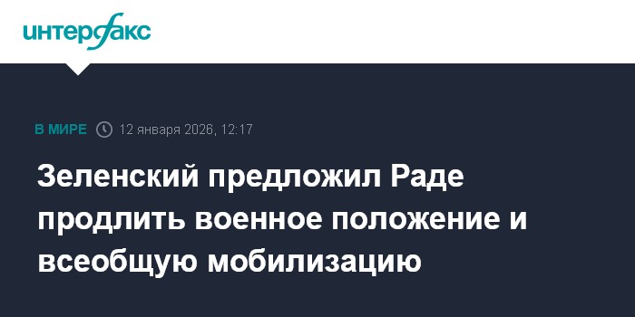 Москва. 12 января. INTERFAX.RU - Президент Украины Владимир Зеленский предлагает Верховной раде утвердить его указы о продлении срока действия военного положения и всеобщей мобилизации, сообщили в понедельник украинские СМИ со ссылкой на сайт парламента.
