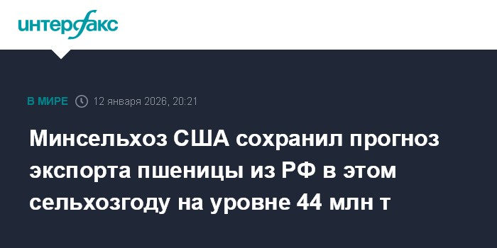 Москва. 12 января. INTERFAX.RU - Минсельхоз США в январском обзоре, опубликованном в понедельник, сохранил прогноз экспорта пшеницы из России в 2025/26 сельхозгоду (начался 1 июля 2025 года) на уровне ноября и декабря - 44 млн тонн.