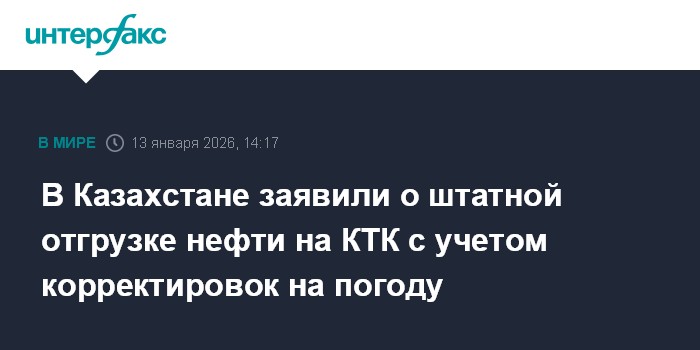 Москва. 13 января. INTERFAX.RU - Отгрузка нефти на терминале Каспийского трубопроводного консорциума (КТК) идет в штатном режиме, с учетом корректировок на погодные условия, сообщили в министерстве энергетики Казахстана.