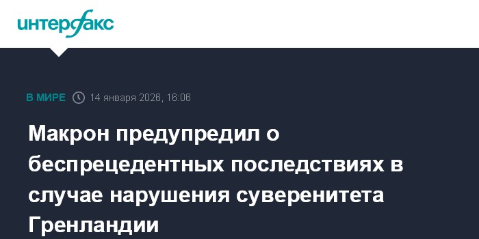 Москва. 14 января. INTERFAX.RU - Президент Франции Эммануэль Макрон в среду выразил солидарность с Данией и заявил, что нарушение суверенитета Гренландии приведет к серьезным последствиям, сообщают французские СМИ.