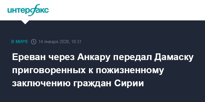 Москва. 14 января. INTERFAX.RU - Ереван передал сирийским властям двух граждан Сирии, приговоренных в Армении к пожизненному заключению по обвинению в участии в войне в Карабахе в качестве наемников азербайджанской стороны, сообщил армянский Минюст.