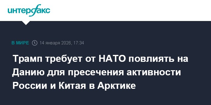 Москва. 14 января. INTERFAX.RU - Президент США Дональд Трамп призвал НАТО повлиять на Данию, чтобы та предотвратила распространение активности России и Китая в регионе Гренландии и Арктики в целом.