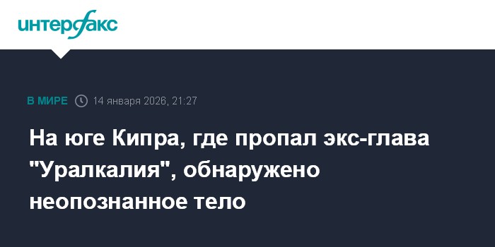 Москва. 14 января. INTERFAX.RU - Неопознанное тело мужчины найдено в среду на южном побережье Кипра спустя примерно неделю после того, как в этом районе исчез бывший глава "Уралкалия" Владислав Баумгертнер, сообщает издание Cyprus Mail.
