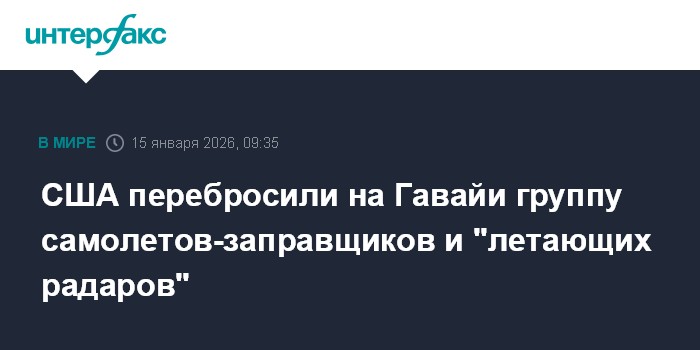 Москва. 15 января. INTERFAX.RU - Соединенные Штаты перебросили на тихоокеанскую базу на Гавайских островах восемь самолетов-заправщики KC-135 Stratotanker и несколько самолетов дальнего радиолокационного обнаружения и управления Е-3 Sentry, следует из сообщения ВВС Национальной гвардии.