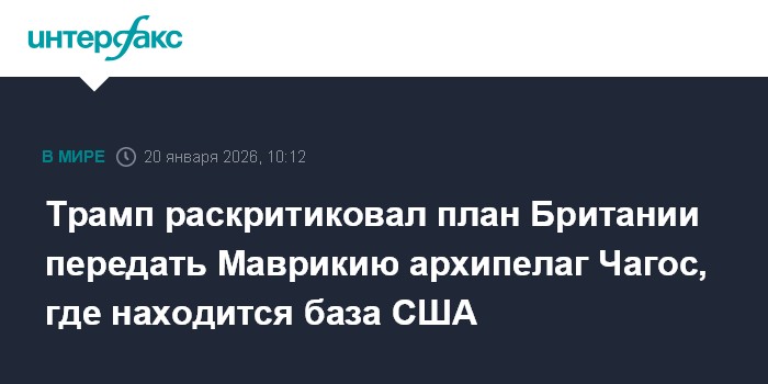 Москва. 20 января. INTERFAX.RU - Президент США Дональд Трамп во вторник заявил, что крайне встревожен планами Великобритании передать Маврикию расположенный в Индийском океане архипелаг Чагос, где на атолле Диего-Гарсия находится американо-британская военная база.