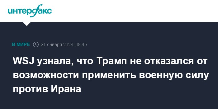 Москва. 21 января. INTERFAX.RU - Президент США Дональд Трамп не отказался от возможности задействовать военную силу в отношении Ирана, сообщает The Wall Street Journal (WSJ) со ссылкой на источники.