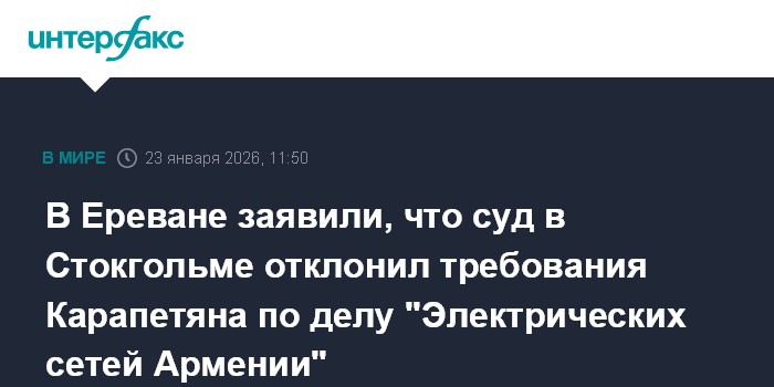 "Стокгольмский арбитражный трибунал 24 декабря 2025 года полностью отклонил ходатайство, поданное Liormand Holdings Limited, Самвелом Карапетяном, Этери Карапетян, Саргисом Карапетяном и Кареном Карапетяном. В рамках ходатайства, помимо прочего, от арбитражного трибунала требовалось подтвердить факт неисполнения Республикой Армения решения чрезвычайного арбитра от 22 июля, восстановить лицензию ЗАО "Электрические сети Армении" (принадлежит семье Карапетяна через зарегистрированную на Кипре Liormand Holdings Limited - ИФ) и полномочия членов его органов управления, а также прекратить полномочия назначенного временного управляющего. Кроме того, трибуналу предлагалось запретить принудительную продажу, отчуждение либо распоряжение иным способом акциями ЭСА или иными активами", - заявила пресс-служба правительства Армении в пятницу.